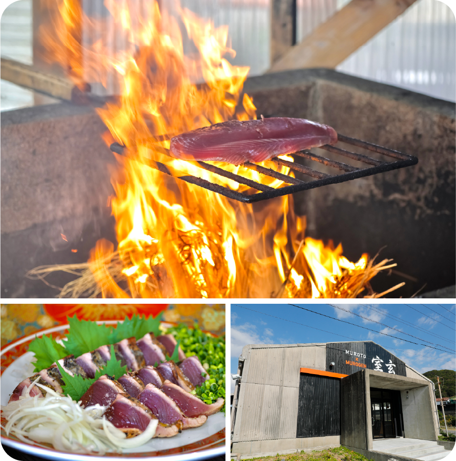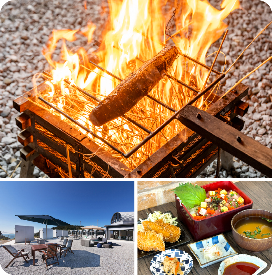 薪炊き土鍋ご飯体験プラン土佐名物の藁焼きカツオタタキ体験と自分でさばいて味わう特別体験に加え、薪炊き土鍋ご飯や室戸食材を使ったBBQもついた欲ばりプラン。翌日の昼食は「室玄」の新鮮海鮮漬け丼を。