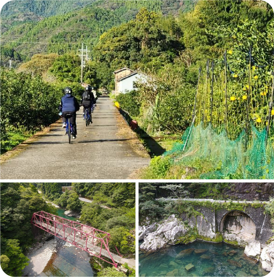 鉄道とゆずロード安田川編日本遺産である森林鉄道の遺構やゆず畑の景観を、安田川沿いにE-バイクで巡るガイド付き少人数ツアー。季節の草花と歴史に触れながら走る爽快ルートで、昼食弁当も付いた自然満喫プラン。