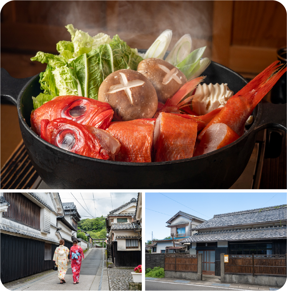 吉良川1棟貸宿泊プラン重伝建・吉良川町の町並みを着物で散策、1棟貸しの宿でゆったり滞在。夕食は古民家でいただく金目鯛鍋とカツオのタタキ、翌朝は炭パンのホットサンドと珈琲で迎える。さらに3食目のランチは姉妹店である「室玄」で海鮮漬け丼を。歴史と美食堪能プラン。